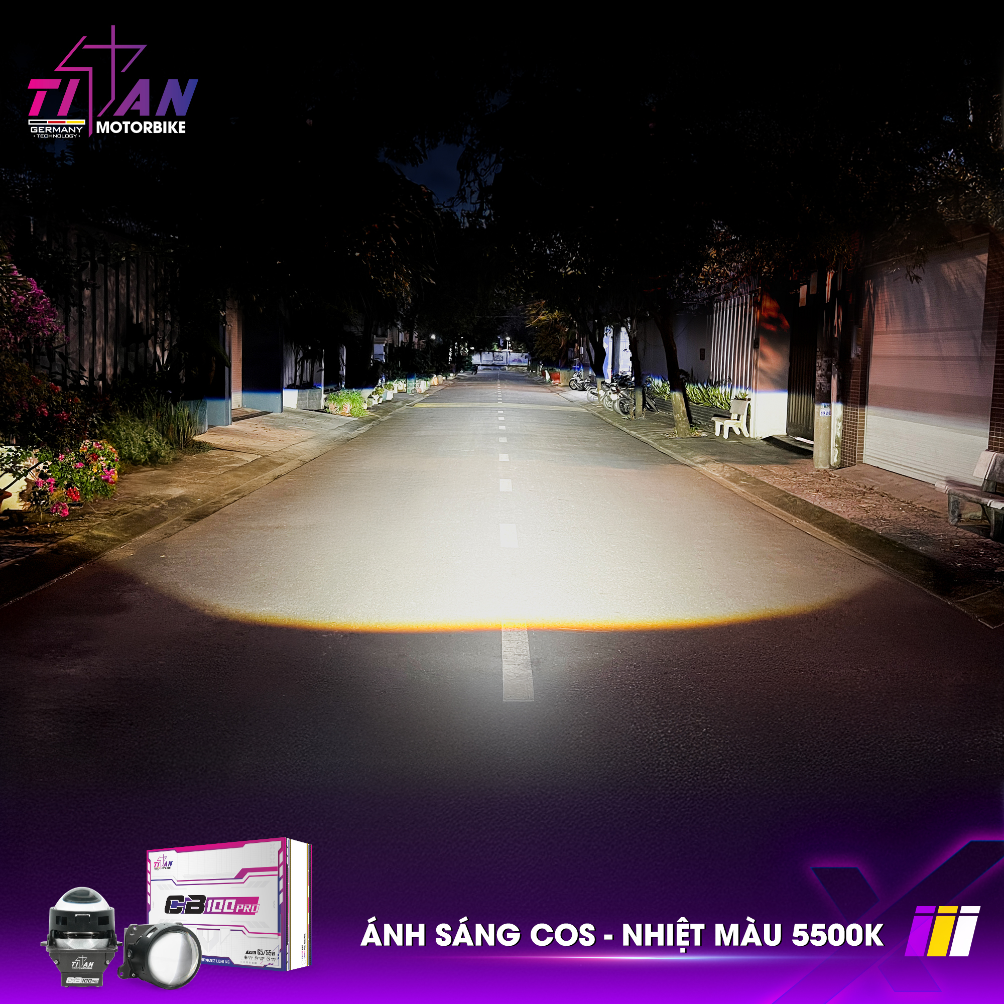Ánh sáng Cos của bi LED Titan Moto CB100 Pro được tối ưu hoàn hảo với công suất khoảng 55W, tạo ra vùng chiếu siêu rộng. Luồng sáng được trải đều, bám đường cực tốt, hỗ trợ tài xế tập trung tối đa ngay cả khi di chuyển trong điều kiện thiếu sáng.