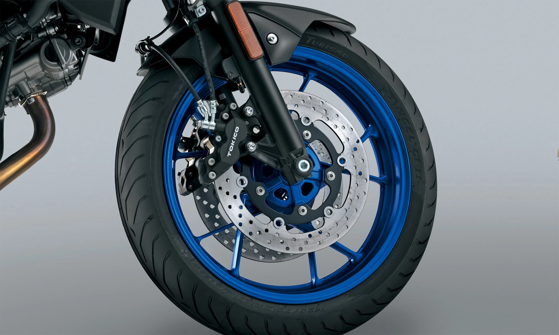 Suzuki SV-7GX 2026 được chú trọng cả về hiệu năng lẫn an toàn, hướng đến trải nghiệm touring trọn vẹn và đáng tin cậy. Hệ thống phanh gồm cặp đĩa đôi phía trước đi kèm cùm phanh Tokico bốn piston mang lại lực hãm mạnh và chính xác, trong khi phanh sau là đĩa đơn giúp kiểm soát ổn định hơn ở mọi dải tốc độ. Hệ thống ABS hai kênh được trang bị tiêu chuẩn, đảm bảo an toàn tối đa trong mọi điều kiện vận hành.