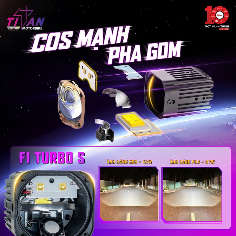 F1 Turbo S sở hữu cấu hình ánh sáng mạnh mẽ 6 (BIG) + 1 + 1 (OSRAM). Ở chế độ Cos với công suất ~42W, F1 Turbo S mang lại khả năng chiếu sáng rõ ràng với chân sáng ngang, cung sáng vuông và tâm sáng đậm. Ánh sáng được phân bổ đều từ trung tâm sang hai bên, tạo ra mặt cắt sắc nét, giúp người lái dễ dàng quan sát ổ gà, đá nhỏ, vạch kẻ đường hay người đi bộ trong điều kiện thiếu sáng.