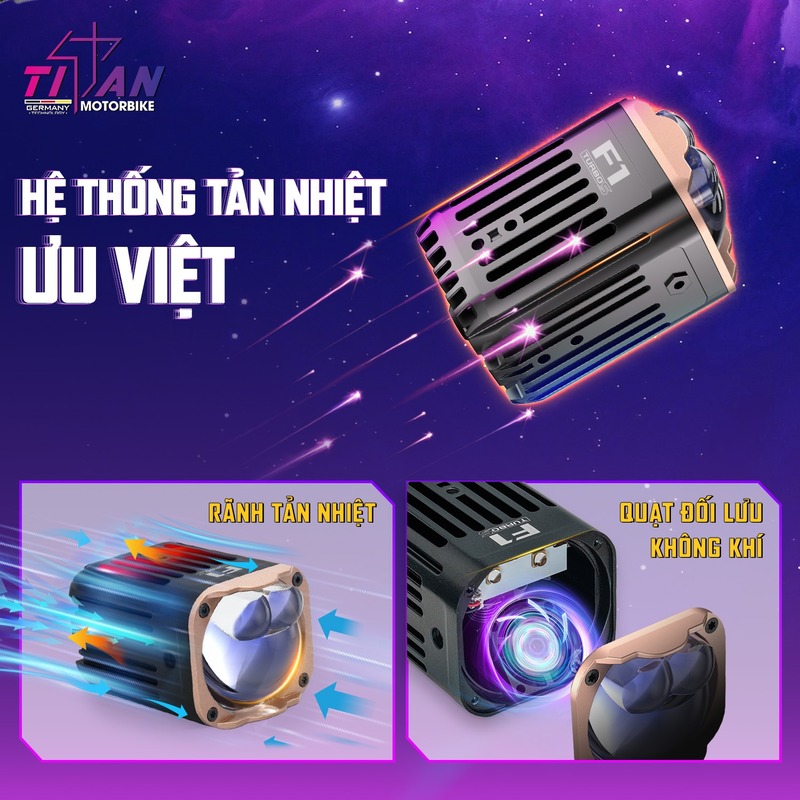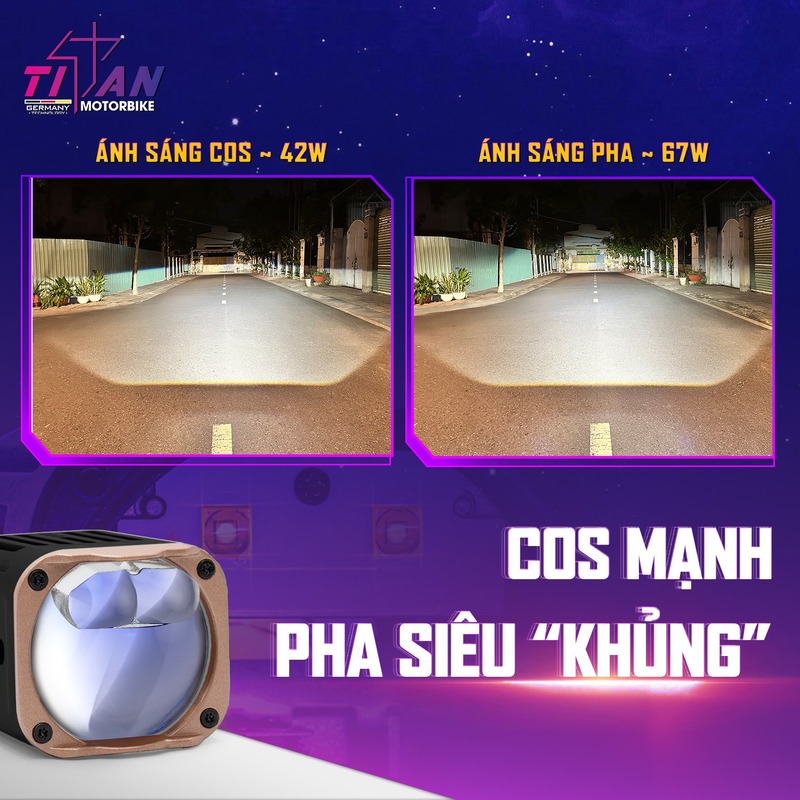 Titan Moto F1 Turbo S sở hữu cấu hình chiếu sáng ấn tượng với cấu hình 6 (BIG) + 1 + 1 chip LED Osram, mang lại hiệu suất ánh sáng mạnh mẽ trong phân khúc đèn trợ sáng bi cầu. Ở chế độ Cos công suất ~42W, đèn tạo chân sáng ngang, cung sáng vuông và tâm sáng đậm, giúp quan sát rõ mặt đường phía trước. Khi chuyển sang Pha với công suất ~67W, luồng sáng được gom chặt, chiếu xa vượt trội và bám đường tốt. Công nghệ trợ pha kép giả lập Laser giúp ánh sáng vừa rộng vừa sâu, mở rộng đáng kể tầm nhìn ban đêm. Nhờ đó, người lái luôn tự tin khi di chuyển trên cao tốc, đường đèo hay những cung đường thiếu sáng.