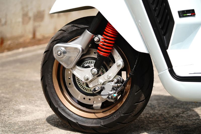Hệ thống giảm xóc trước sử dụng lò xo đôi – khác biệt với thiết kế lệch một bên trên Vespa. Yên xe cao 790 mm, thiết kế phân tầng nhẹ, tạo tư thế ngồi thoải mái. Một số chi tiết trang trí nổi bật như cờ Italy và huy hiệu sư tử Rampant Lion đặc trưng được đặt tinh tế ở sàn để chân và yếm xe, tăng thêm vẻ sang trọng và nhận diện thương hiệu.