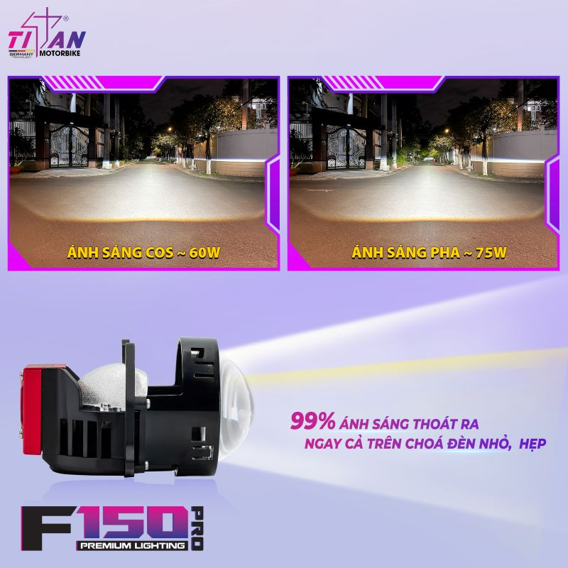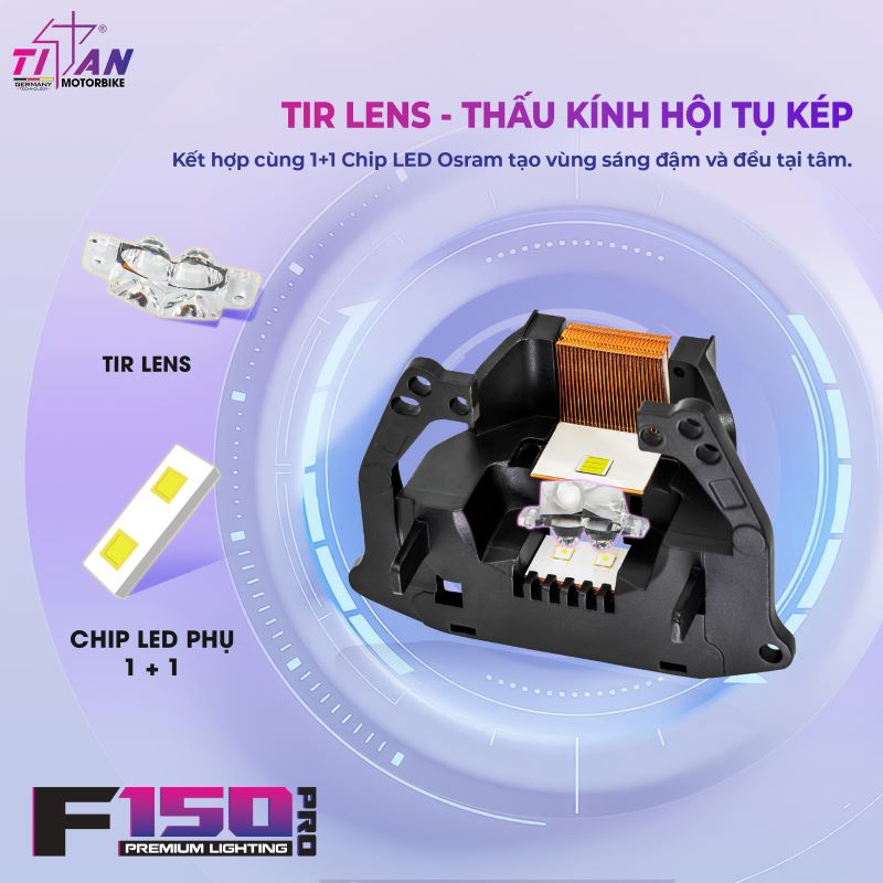 Titan Moto F150 Pro được trang bị công nghệ TIR Lens hiện đại, giúp tối ưu hiệu quả thoát sáng lên đến 99%. Nhờ đó, ánh sáng được phân bổ đồng đều, hạn chế thất thoát và đặc biệt phù hợp với các dòng xe có thiết kế chóa hẹp. Công nghệ này còn giúp tăng độ gom sáng, cho ánh sáng đậm và rõ nét hơn. Kết quả là người lái có tầm nhìn tốt hơn trong nhiều điều kiện di chuyển khác nhau. Đây chính là điểm khác biệt nổi bật so với nhiều dòng bi LED cùng phân khúc.