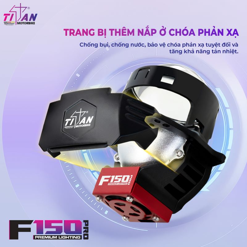 Không chỉ mạnh về công nghệ, Titan Moto F150 Pro còn gây ấn tượng với thiết kế body nhỏ gọn. Kích thước tối ưu giúp dễ dàng lắp đặt trên nhiều dòng xe mà không ảnh hưởng đến kết cấu nguyên bản. Ngoài ra, sản phẩm còn được trang bị nắp chóa phản xạ giúp tăng khả năng chống nước và hỗ trợ tản nhiệt hiệu quả hơn. Thiết kế này vừa đảm bảo tính thẩm mỹ, vừa nâng cao độ bền trong quá trình sử dụng.
