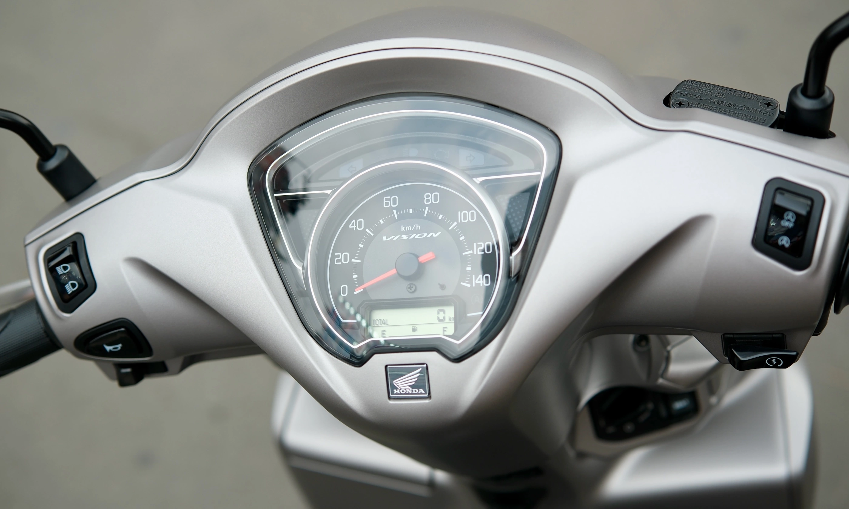 Vision 2026 giữ nguyên thiết kế quen thuộc, trang bị đèn định vị LED trên các phiên bản Thể thao, Đặc biệt và Cao cấp. Mặt đồng hồ kết hợp analog và LCD, logo 3D, mâm đúc cùng khung eSAF tiếp tục được duy trì như đời trước.