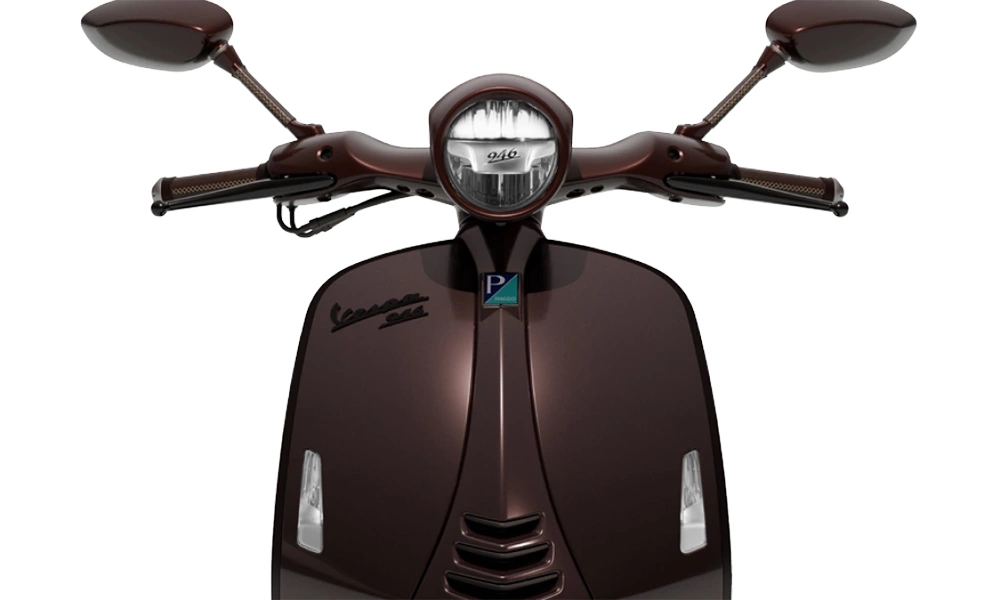 Vespa 946 Horse khoác lên mình bộ dàn áo màu nâu ánh kim sang trọng, cuốn hút ngay từ ánh nhìn đầu tiên. Các chi tiết trang trí bằng da cao cấp và sắc vàng được phối hợp hài hòa, toát lên vẻ xa xỉ đặc trưng. Chất liệu da xuất hiện trên tay nắm, nổi bật với đường chỉ khâu hình thoi chạy dọc đầy tinh tế. Yên xe bọc da cao cấp, kết hợp cùng chỉ khâu màu vàng, tạo nên nét nhận diện riêng biệt và cảm giác ngồi êm ái, đẳng cấp.