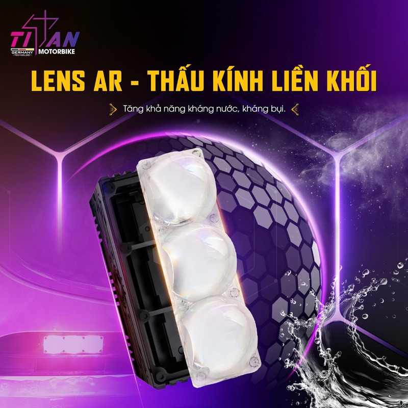 Titan Moto M30 Ultra V2 được trang bị lens xanh AR tràn viền nguyên khối - công nghệ cao cấp giúp tối ưu khả năng truyền dẫn ánh sáng. Lớp phủ AR có tác dụng giảm phản xạ bề mặt, hạn chế thất thoát quang năng và tăng độ xuyên sáng tốt ngay cả trong sương mù hay mưa lớn. Nhờ thiết kế lens liền khối, ánh sáng đầu ra đạt độ đồng đều cao, hạn chế hiện tượng loang sáng và mang lại cảm giác dễ chịu cho mắt khi sử dụng lâu dài.