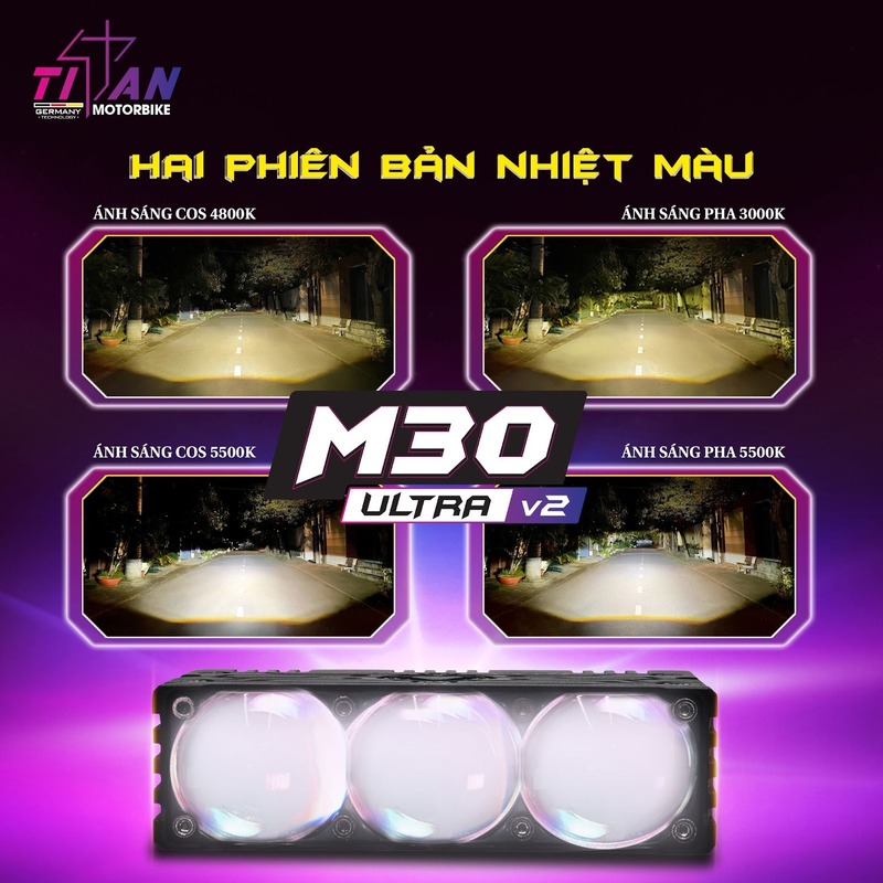 Đèn trợ sáng Titan Moto M30 Ultra V2 mang đến giải pháp nâng cấp ánh sáng mạnh mẽ với hiệu năng chiếu xa ấn tượng, ánh sáng rõ nét và ổn định trong nhiều điều kiện di chuyển. Nếu bạn đang tìm kiếm giải pháp tăng sáng chất lượng, hãy liên hệ Titan Moto hoặc các đại lý chính hãng để được tư vấn và trải nghiệm sản phẩm.
