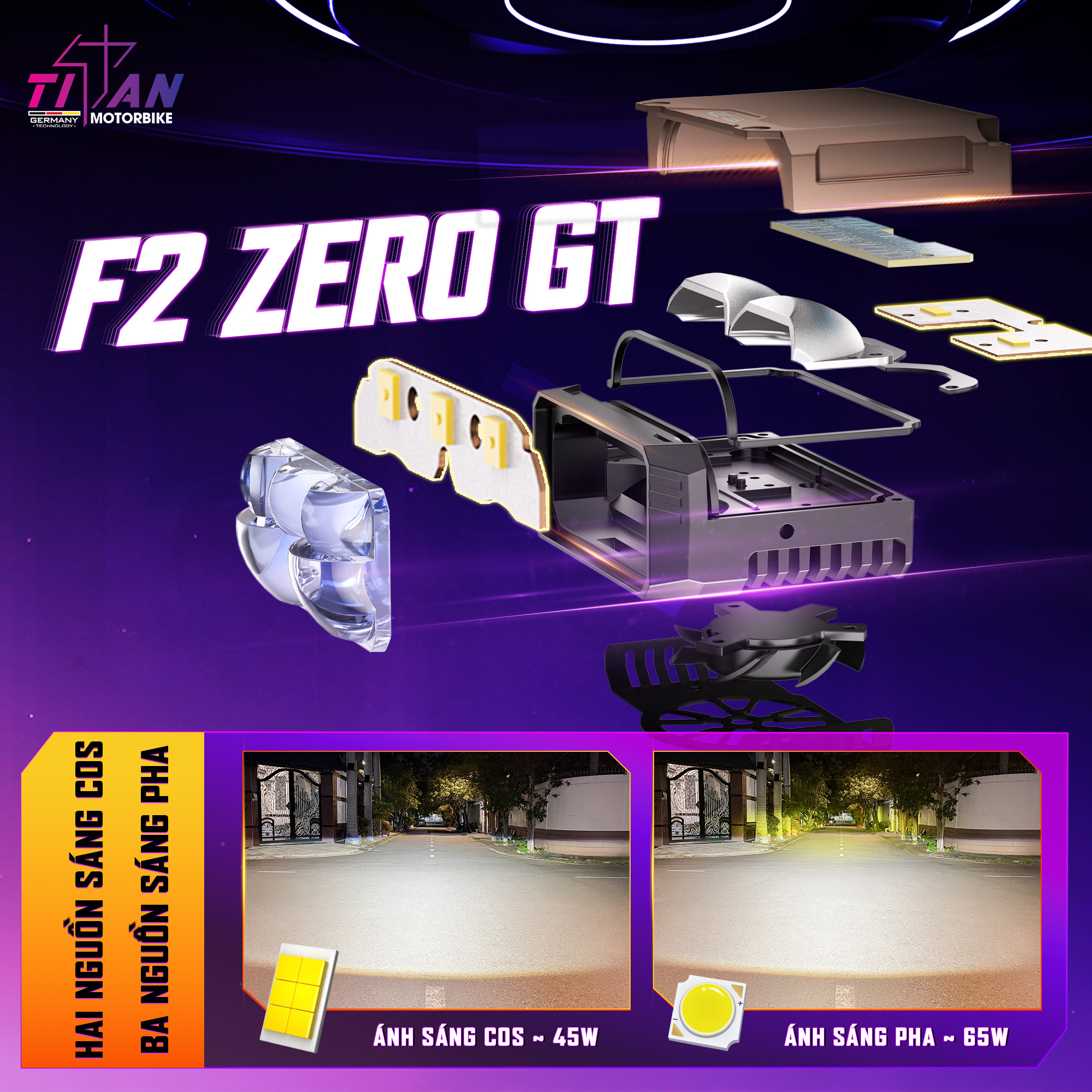 Sở hữu cấu hình 6+6+1+1+1 ấn tượng, Titan Moto F2 Zero GT khẳng định đẳng cấp với hiệu năng chiếu sáng mạnh mẽ và linh hoạt trong mọi điều kiện vận hành. Ánh sáng Cos được tối ưu mở rộng, phân bổ đồng đều, phủ kín mặt đường, giúp tái hiện rõ nét từng chi tiết và tăng khả năng quan sát ở cự ly gần. Ở chế độ Pha, ánh sáng được gom chuẩn xác, cho độ chiếu xa vượt trội, sắc nét và tập trung cao, mang lại tầm nhìn chủ động trên những cung đường tối hoặc khi di chuyển tốc độ cao.