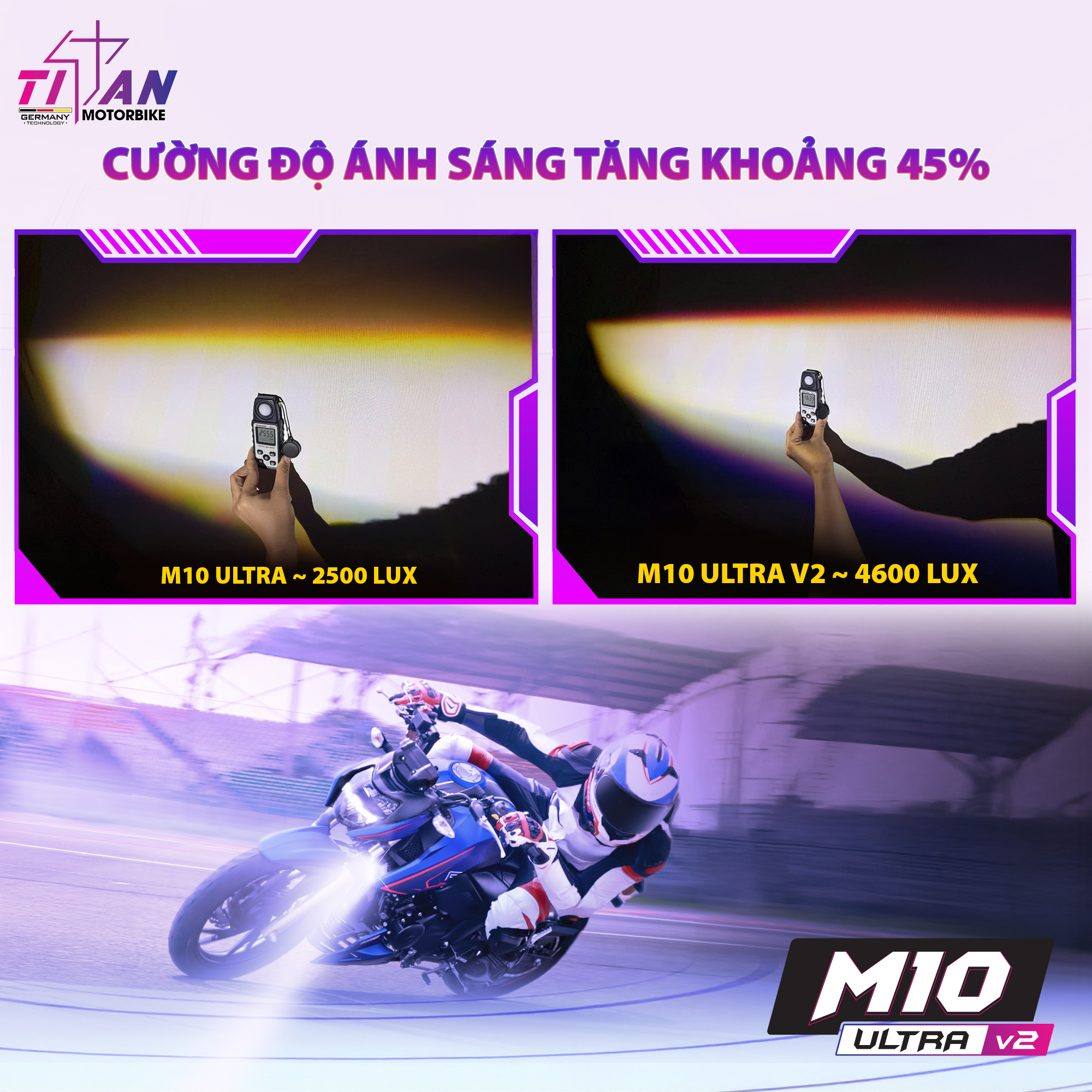 Không chỉ dừng lại ở bước tiến đột phá trong thiết kế và công nghệ tản nhiệt, M10 Ultra V2 tiếp tục khẳng định vị thế dẫn đầu với công suất ấn tượng lên tới 28W, mang lại hiệu năng chiếu sáng vượt trội - mạnh hơn 45% so với thế hệ tiền nhiệm. Ánh sáng sắc nét, cường độ cao cùng khả năng phân bổ đồng đều trên toàn mặt đường giúp người lái quan sát rõ ràng từng chi tiết, nhận diện chướng ngại vật từ xa và chủ động xử lý mọi tình huống một cách an toàn, tự tin.